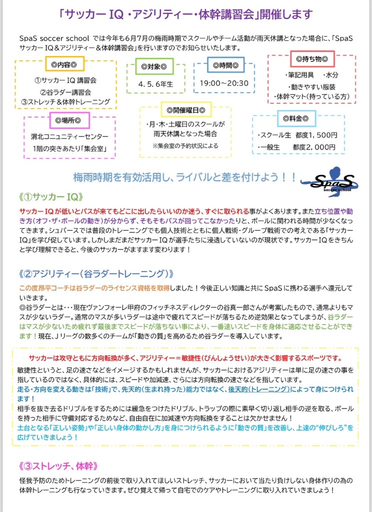 雨天時「サッカーIQ・アジリティー・ストレッチ体幹講習会」を行います。