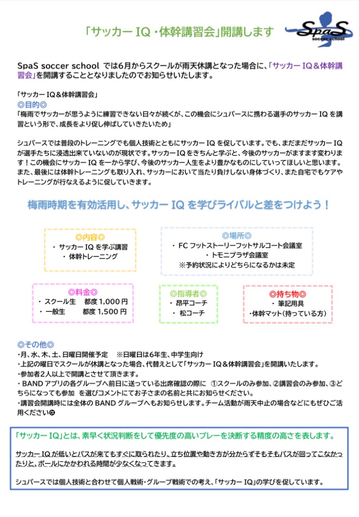 6月からスクール雨天休講時に「サッカーIQ&体幹講習会」を開講することになりました!