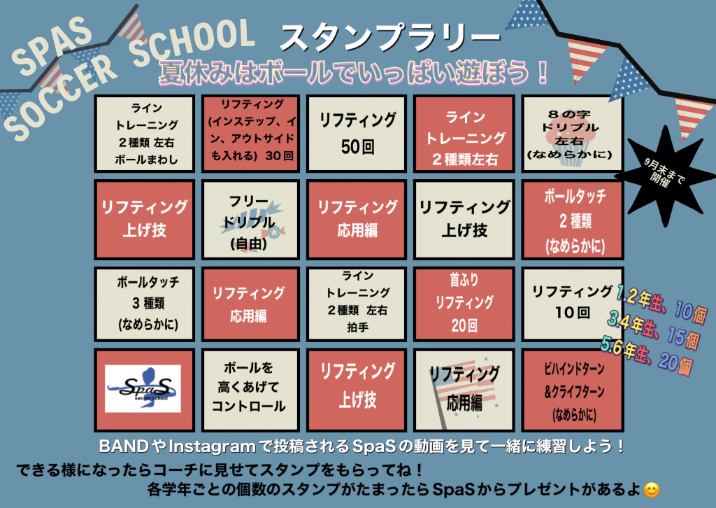 夏休みイベント「ボールで遊ぼう!スタンプラリー」として、SpaSのInstagramでコーチによるボールタッチ等の動画をどんどん投稿していきます。動画を見ながら自主練習や遊びの中でぜひボールタッチの練習をしてくださいね!